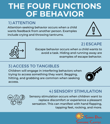 The predominant four functions of behavior are attention, escape, access, and sensory needs. These four functions allow us to understand and categorize someone’s actions, as well as determine why behaviors occur.